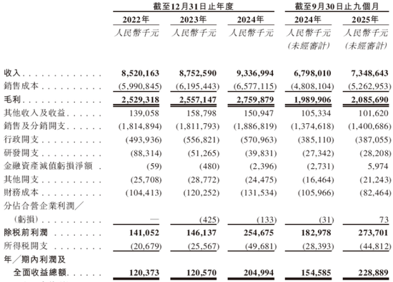 接连“买买买”刺激业绩持续增长。招股书显示,在过去的2022年、2023年、2024年和2025年前九个月,孩子王的营业收入分别为人民币85.20亿、87.53亿、93.37亿和73.49亿元,相应期间的净利润分别为人民币1.20亿、1.21亿、2.05亿和2.29亿元。