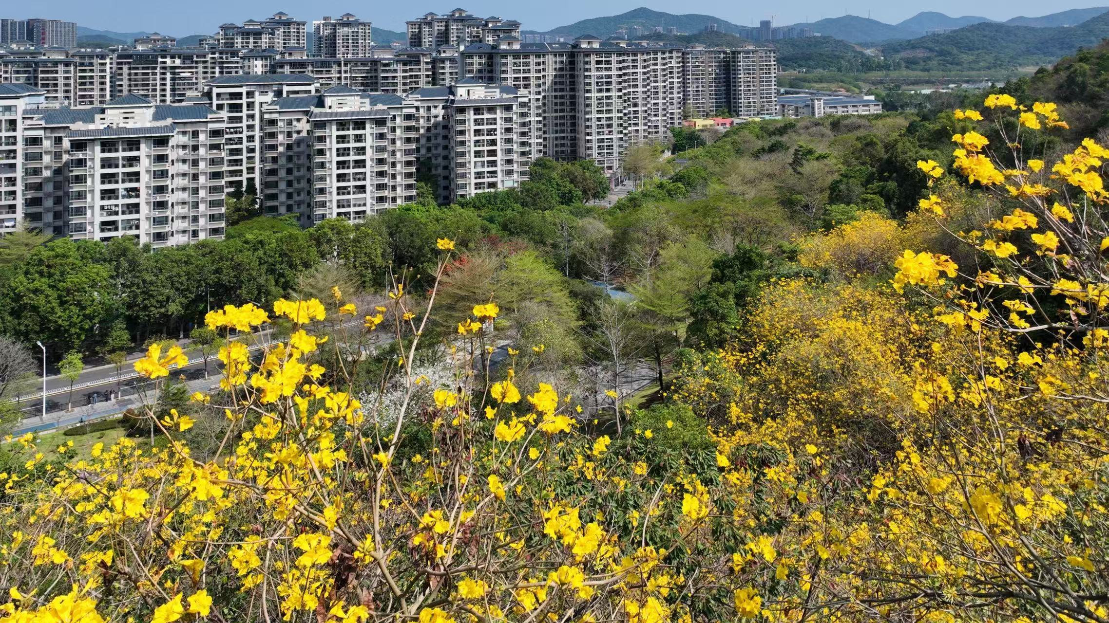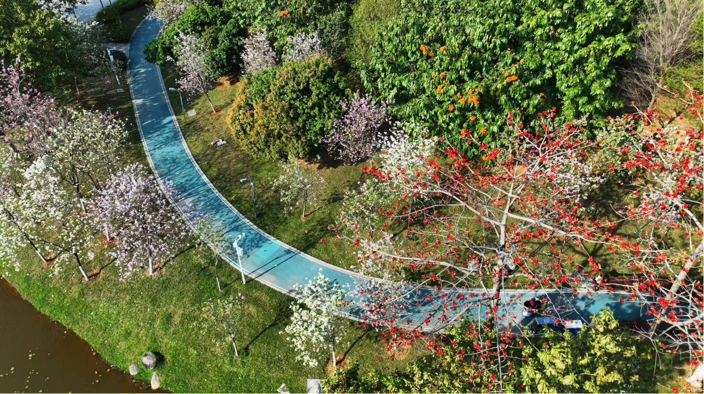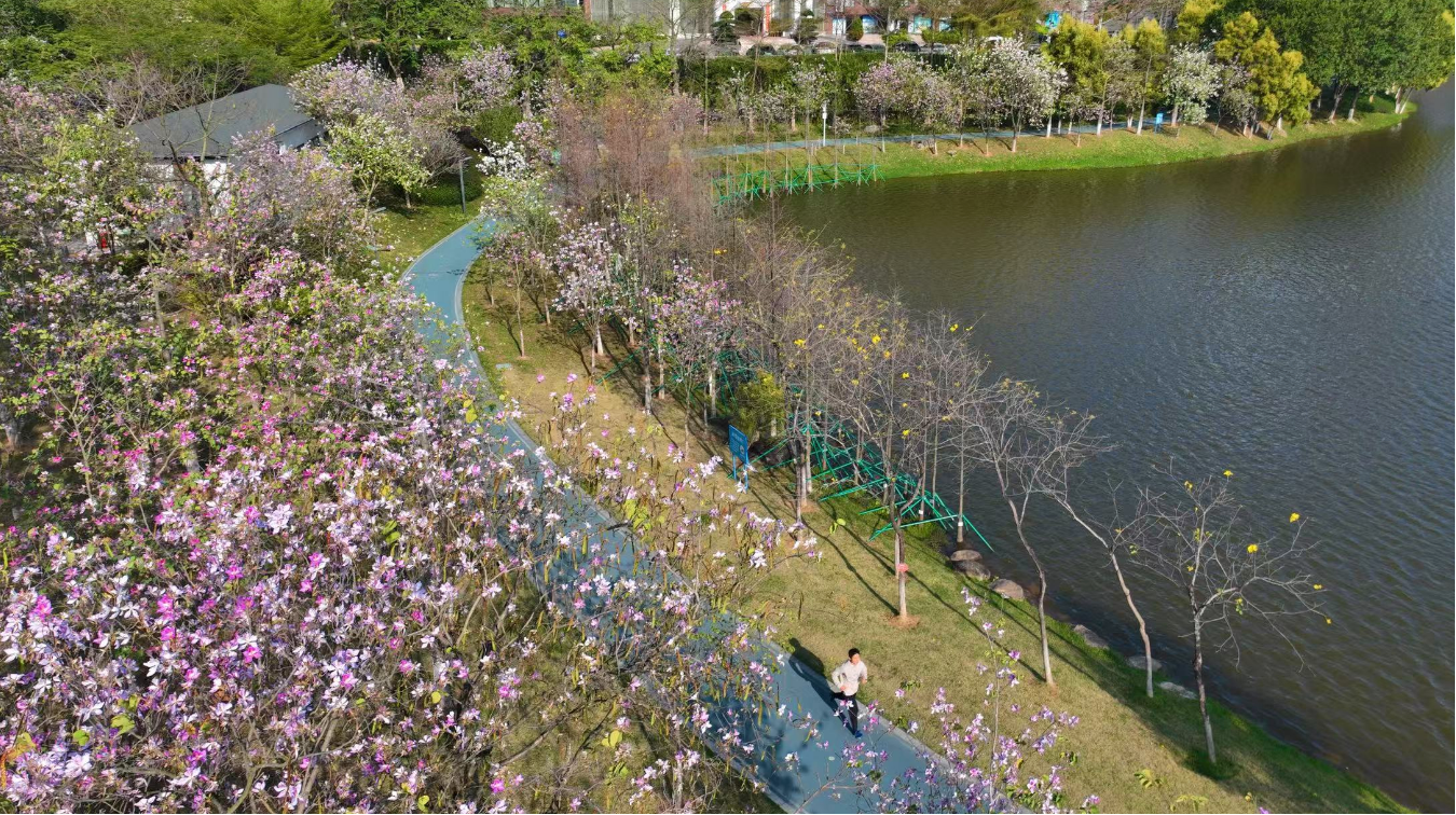 市民广场依山就势,与水体相映成趣,宫粉紫荆与青梅次第花开,年轻的父母推着婴儿车漫步;善坑顶公园内,600余株黄花风铃木沿山势铺展,花开时节漫山鎏金,落花铺满木栈道,退休教师带着画板写生;发展公园以水为魂,荷花、菖蒲、鸢尾等水生植物点缀溪畔,形成“湿地花溪”的独特生态景观。