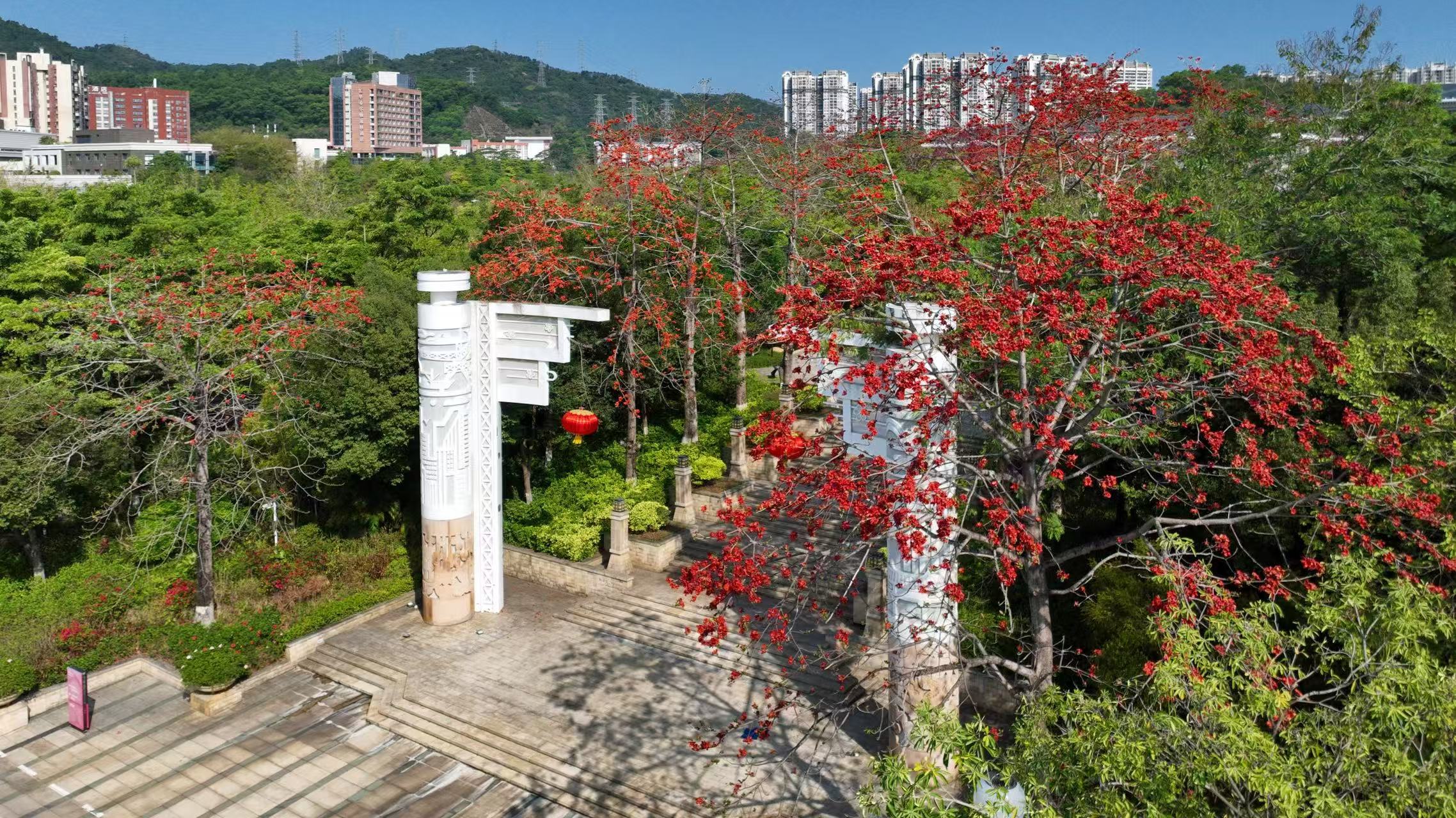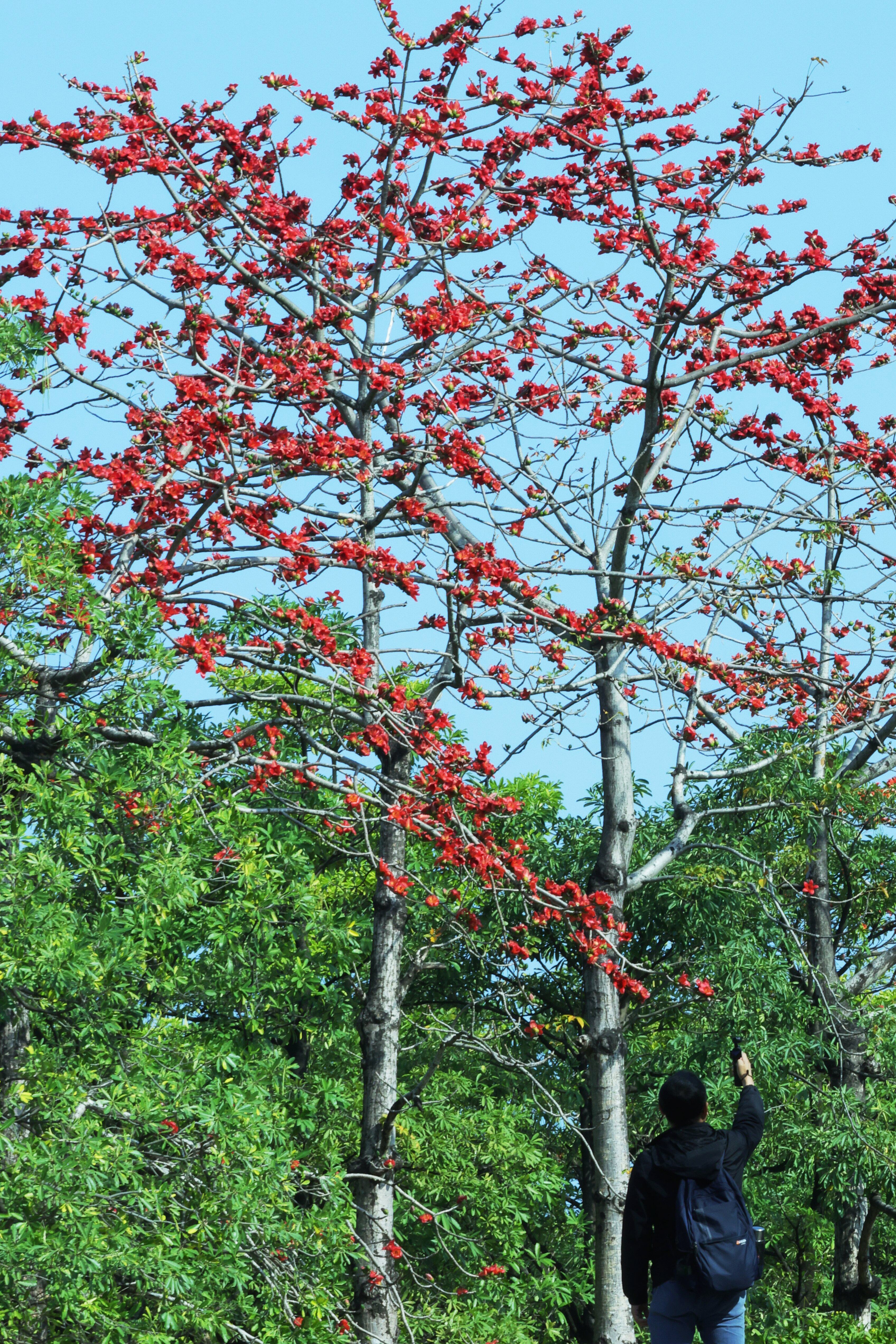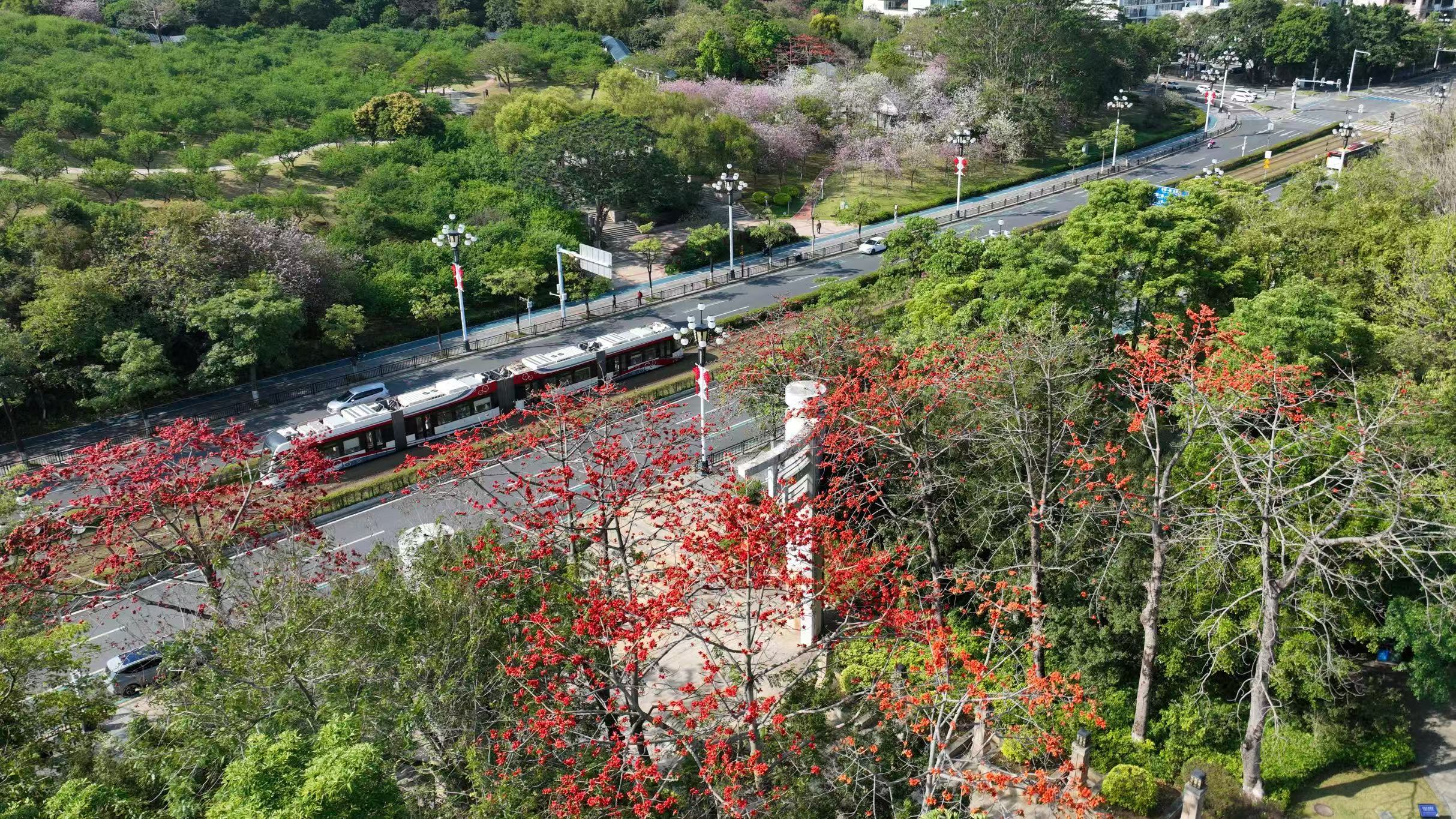 木棉以炽烈赤红彰显英雄气质。开发大道、香雪三路、开创大道及市民广场、创业公园内,高大挺拔的木棉树擎起满树红花,如一支支燃烧的火炬点亮城市天际。春风拂过,花朵扑簌坠地,热心市民俯身拾起,在绿草地上摆成爱心、星星等图案,原本高悬枝头的“英雄花”,落地后多了几分人间温情。在附近工作的工程师王先生告诉记者,今天休假的他特意来放松赏花。“我们搞芯片设计的,讲究的是纳米级的精确,但木棉不一样,它开得不管不顾,这种生命力特别感染我。”