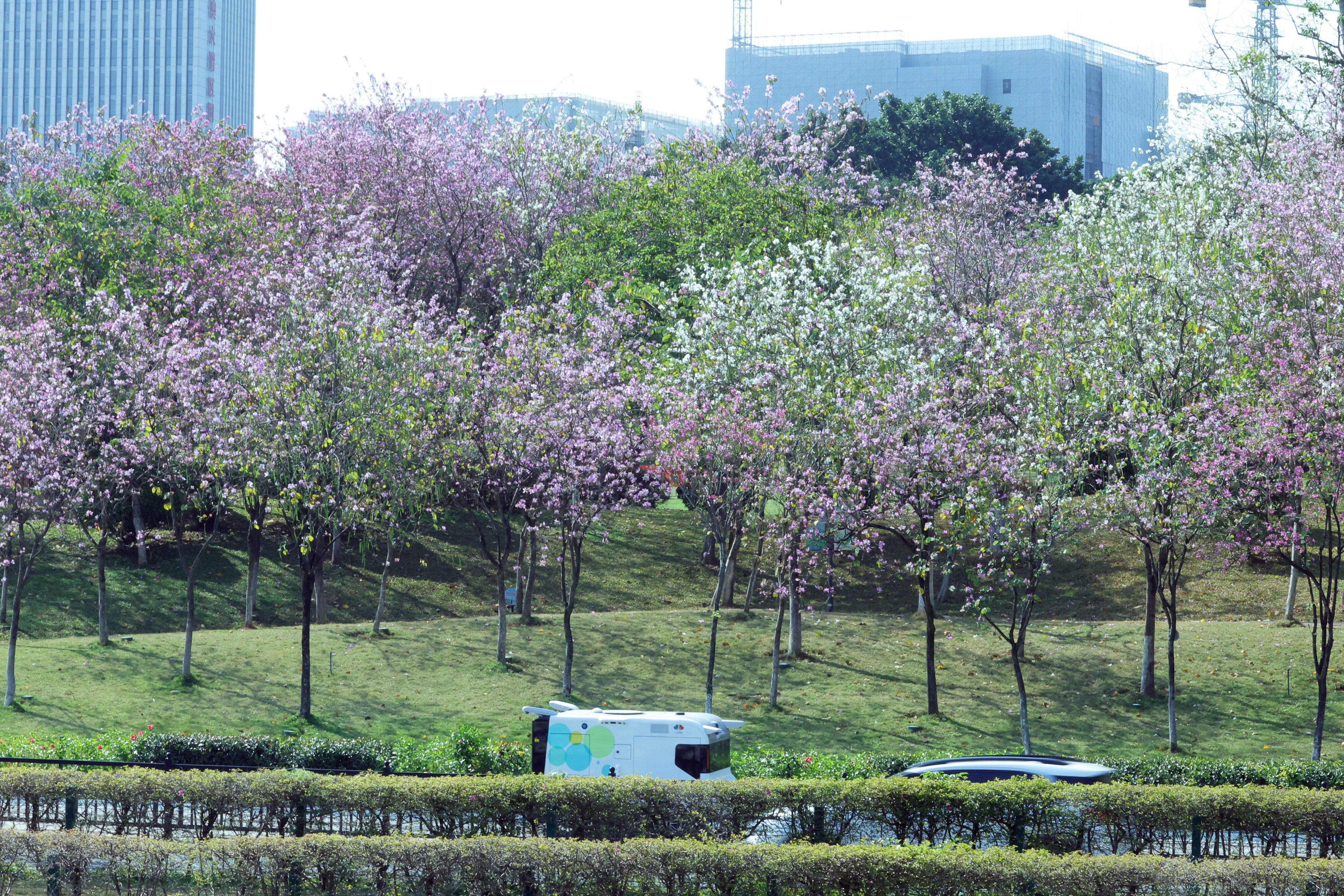 漫步黄埔,春色如绣。宫粉紫荆以温柔粉白铺陈出城市底色——生物岛南山公园、狮子岭公园、发展公园、善坑顶公园内,花枝低垂,落英缤纷;揽月路、广汕路、知识大道、香雪大道沿线,粉白紫三色交织绵延,车行其间,宛若驶入一条没有尽头的“春日隧道”,两侧花影掠过车窗,一路繁花相送。